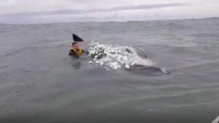 Surfista salva baleia de rede de pesca após três horas usando faca e tesoura; assista
