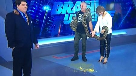 Eca! Cobra faz cocô no 'Brasil Urgente' e deixa Catia e Datena constrangidos